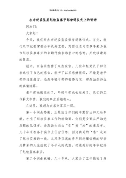 【七哥公文】2025年:【七哥公文】在市纪委监委纪检监察干部荣退仪式上的讲话+更多免费公文+VX:QiGeGongWen2024+更多免费公文+VX:QiGeGongWen2024