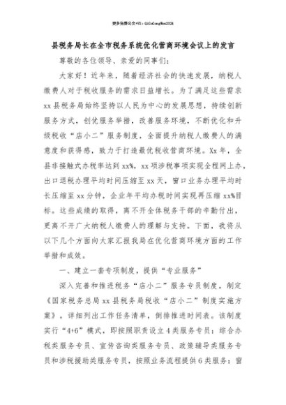 【七哥公文】2025年:【七哥公文】县税务局长在全市税务系统优化营商环境会议上的发言+更多免费公文+VX:QiGeGongWen2024+更多免费公文+VX:QiGeGongWen2024