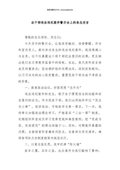 【七哥公文】2025年:【七哥公文】在干部违法违纪案件警示会上的表态发言+更多免费公文+VX:QiGeGongWen2024+更多免费公文+VX:QiGeGongWen2024