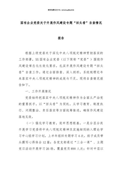 【七哥公文】2025年:【七哥公文】国有企业党委关于开展作风建设专题“回头看”自查情况报告+更多免费公文+VX:QiGeGongWen2024+更多免费公文+VX:QiGeGongWen2024
