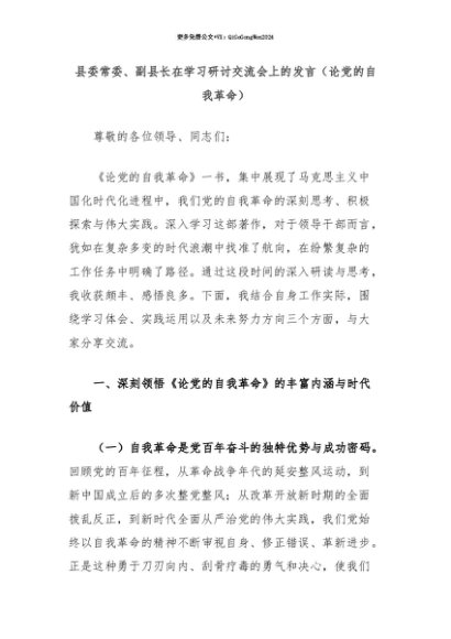 【七哥公文】2025年:【七哥公文】县委常委、副县长在学习研讨交流会上的发言(论党的自我革命)+更多免费公文+VX:QiGeGongWen2024+更多免费公文+VX:QiGeGongWen2024