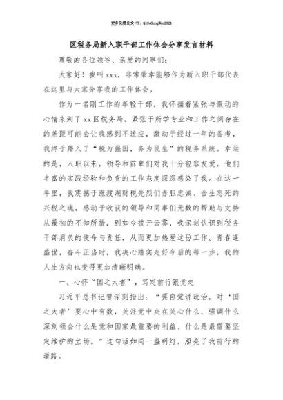 【七哥公文】2025年:【七哥公文】区税务局新入职干部工作体会分享发言材料+更多免费公文+VX:QiGeGongWen2024+更多免费公文+VX:QiGeGongWen2024