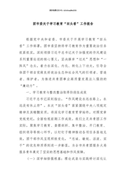 【七哥公文】2025年:【七哥公文】团市委关于学习教育“回头看”工作报告+更多免费公文+VX:QiGeGongWen2024+更多免费公文+VX:QiGeGongWen2024