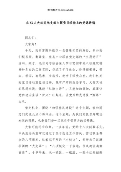 【七哥公文】2025年:【七哥公文】在XX人大机关党支部主题党日活动上的党课讲稿+更多免费公文+VX:QiGeGongWen2024+更多免费公文+VX:QiGeGongWen2024
