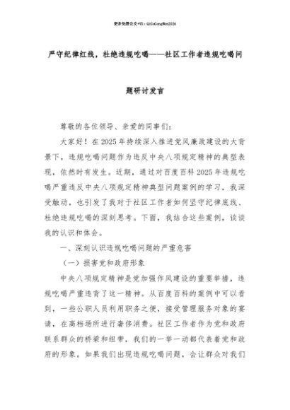 【七哥公文】2025年:【七哥公文】严守纪律红线,杜绝违规吃喝——社区工作者违规吃喝问题研讨发言+更多免费公文+VX:QiGeGongWen2024+更多免费公文+VX:QiGeGongWen2024