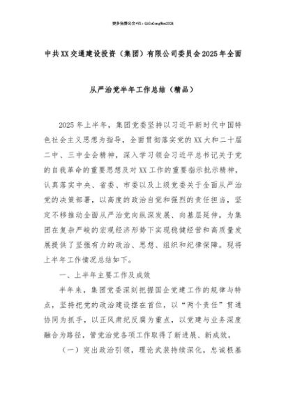 【七哥公文】2025年:【七哥公文】中共XX交通建设投资(集团)有限公司委员会2025年全面从严治党半年工作总结(精品)+更多免费公文+VX:QiGeGongWen2024+更多免费公文+VX:QiGeGongWen2024