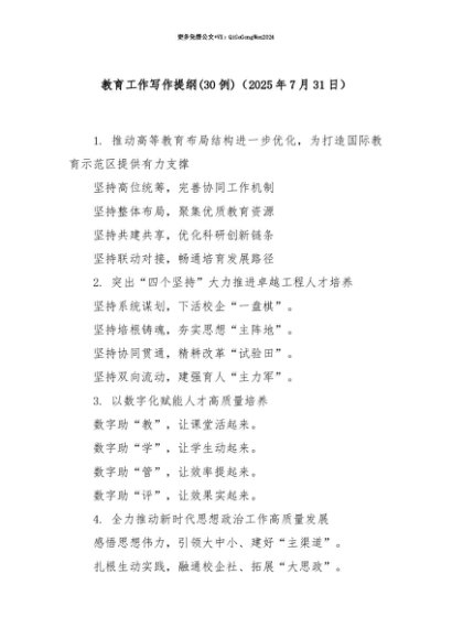 【七哥公文】2025年:【七哥公文】(30例)教育工作写作提纲(2025年7月31日)+更多免费公文+VX:QiGeGongWen2024+更多免费公文+VX:QiGeGongWen2024