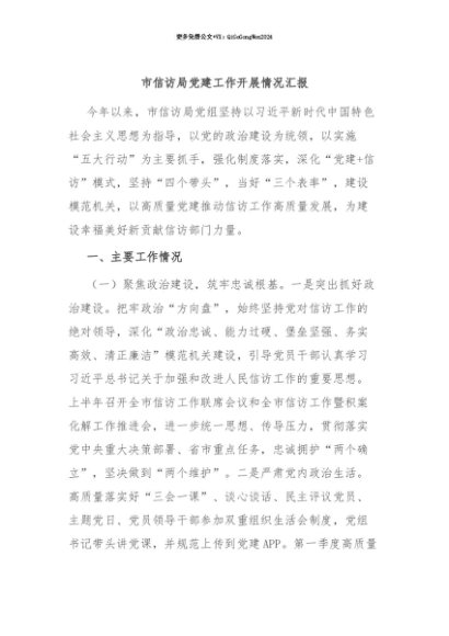【七哥公文】2025年:【七哥公文】市信访局党建工作开展情况汇报+更多免费公文+VX:QiGeGongWen2024+更多免费公文+VX:QiGeGongWen2024