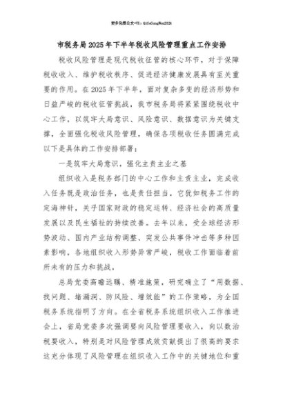 【七哥公文】2025年:【七哥公文】市税务局2025年下半年税收风险管理重点工作安排+更多免费公文+VX:QiGeGongWen2024+更多免费公文+VX:QiGeGongWen2024