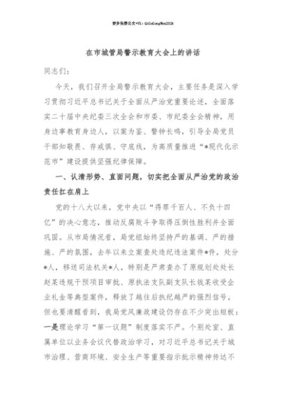 【七哥公文】2025年:【七哥公文】在市城管局警示教育大会上的讲话+更多免费公文+VX:QiGeGongWen2024+更多免费公文+VX:QiGeGongWen2024