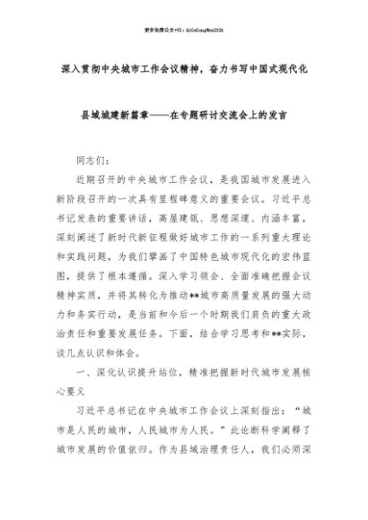 【七哥公文】2025年:【七哥公文】深入贯彻中央城市工作会议精神,奋力书写中国式现代化县域城建新篇章——在专题研讨交流会上的发言+更多免费公文+VX:QiGeGongWen2024+更多免费公文+VX:QiGeGongWen2024