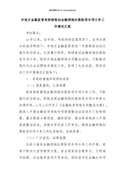 【七哥公文】2025年:【七哥公文】市地方金融监管局持续推动金融领域扫黑除恶专项斗争工作情况汇报+更多免费公文+VX:QiGeGongWen2024+更多免费公文+VX:QiGeGongWen2024