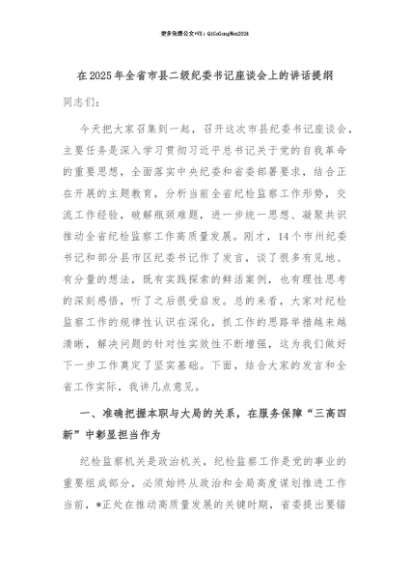 【七哥公文】2025年:【七哥公文】在2025年全省市县二级纪委书记座谈会上的讲话提纲+更多免费公文+VX:QiGeGongWen2024+更多免费公文+VX:QiGeGongWen2024