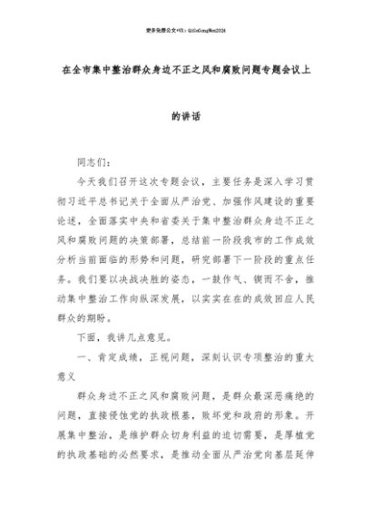【七哥公文】2025年:【七哥公文】在全市集中整治群众身边不正之风和腐败问题专题会议上的讲话+更多免费公文+VX:QiGeGongWen2024+更多免费公文+VX:QiGeGongWen2024