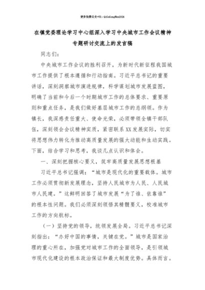 【七哥公文】2025年:【七哥公文】在镇党委理论学习中心组深入学习中央城市工作会议精神专题研讨交流上的发言稿+更多免费公文+VX:QiGeGongWen2024+更多免费公文+VX:QiGeGongWen2024
