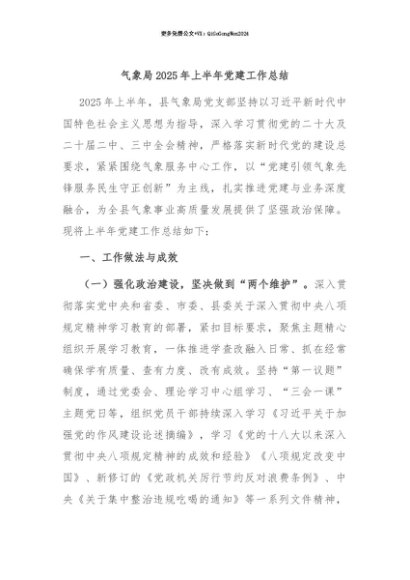 【七哥公文】2025年:【七哥公文】气象局2025年上半年党建工作总结+更多免费公文+VX:QiGeGongWen2024+更多免费公文+VX:QiGeGongWen2024