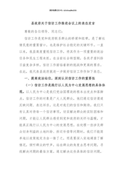 【七哥公文】2025年:【七哥公文】县政府关于信访工作推进会议上的表态发言+更多免费公文+VX:QiGeGongWen2024+更多免费公文+VX:QiGeGongWen2024