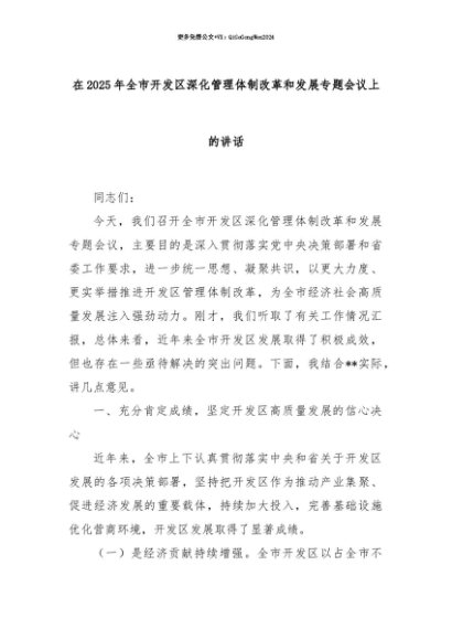 【七哥公文】2025年:【七哥公文】在2025年全市开发区深化管理体制改革和发展专题会议上的讲话+更多免费公文+VX:QiGeGongWen2024+更多免费公文+VX:QiGeGongWen2024