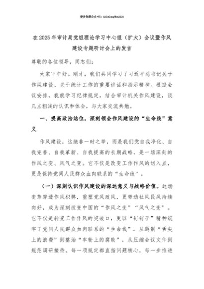 【七哥公文】2025年:【七哥公文】在2025年审计局党组理论学习中心组(扩大)会议暨作风建设专题研讨会上的发言+更多免费公文+VX:QiGeGongWen2024+更多免费公文+VX:QiGeGongWen2024