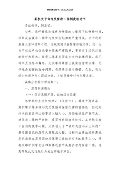 【七哥公文】2025年:【七哥公文】某机关干部违反保密工作制度检讨书+更多免费公文+VX:QiGeGongWen2024+更多免费公文+VX:QiGeGongWen2024