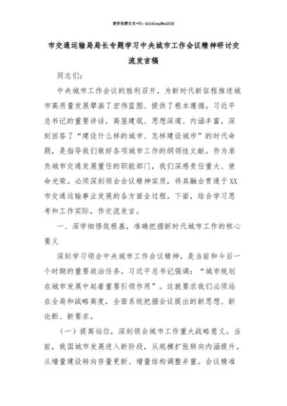【七哥公文】2025年:【七哥公文】市交通运输局局长专题学习中央城市工作会议精神研讨交流发言稿+更多免费公文+VX:QiGeGongWen2024+更多免费公文+VX:QiGeGongWen2024