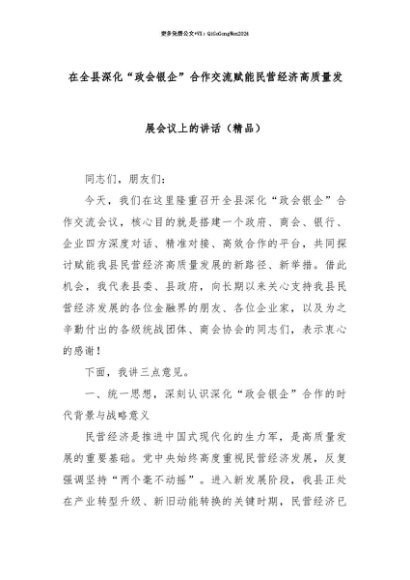 【七哥公文】2025年:【七哥公文】在全县深化“政会银企”合作交流赋能民营经济高质量发展会议上的讲话(精品)+更多免费公文+VX:QiGeGongWen2024+更多免费公文+VX:QiGeGongWen2024