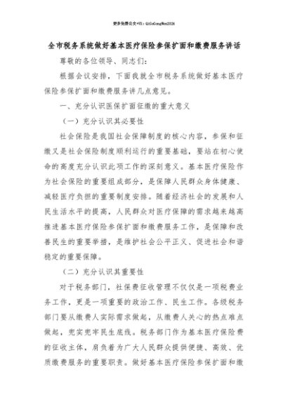 【七哥公文】2025年:【七哥公文】全市税务系统做好基本医疗保险参保扩面和缴费服务讲话+更多免费公文+VX:QiGeGongWen2024+更多免费公文+VX:QiGeGongWen2024