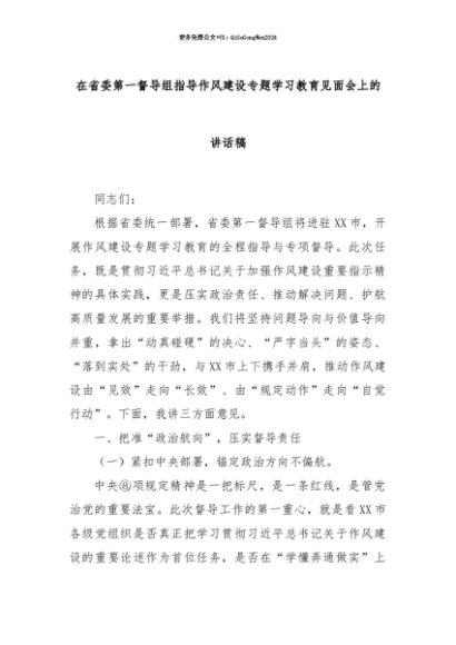 【七哥公文】2025年:【七哥公文】在省委第一督导组指导作风建设专题学习教育见面会上的讲话稿+更多免费公文+VX:QiGeGongWen2024+更多免费公文+VX:QiGeGongWen2024