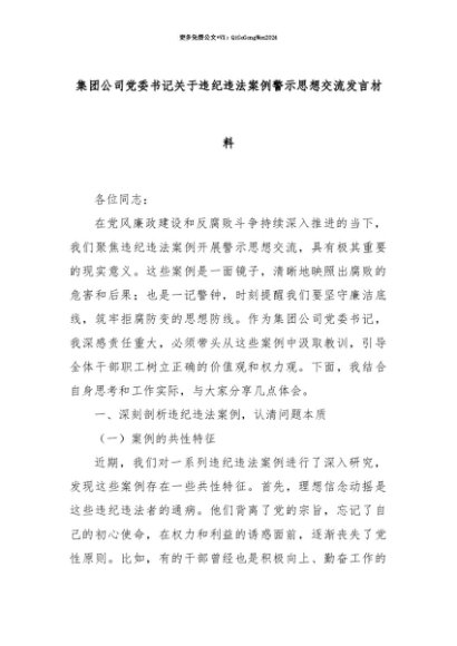 【七哥公文】2025年:【七哥公文】集团公司党委书记关于违纪违法案例警示思想交流发言材料+更多免费公文+VX:QiGeGongWen2024+更多免费公文+VX:QiGeGongWen2024