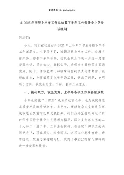 【七哥公文】2025年:【七哥公文】在2025年医院上半年工作总结暨下半年工作部署会上的讲话提纲+更多免费公文+VX:QiGeGongWen2024+更多免费公文+VX:QiGeGongWen2024