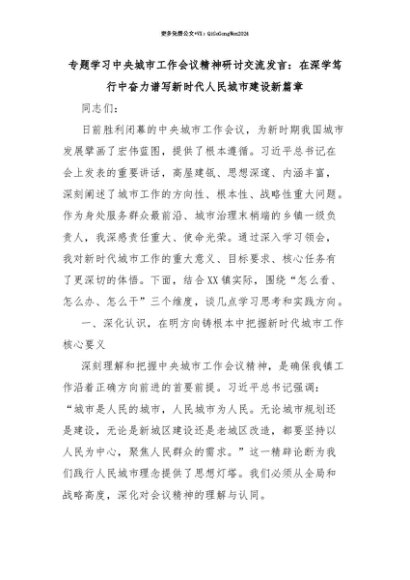 【七哥公文】2025年:【七哥公文】专题学习中央城市工作会议精神研讨交流发言:在深学笃行中奋力谱写新时代人民城市建设新篇章+更多免费公文+VX:QiGeGongWen2024+更多免费公文+VX:QiGeGongWen2024