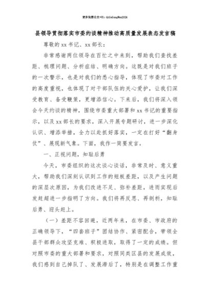 【七哥公文】2025年:【七哥公文】县领导贯彻落实市委约谈精神推动高质量发展表态发言稿+更多免费公文+VX:QiGeGongWen2024+更多免费公文+VX:QiGeGongWen2024