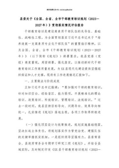 【七哥公文】2025年:【七哥公文】县委关于《全国、全省、全市干部教育培训规划(2023-2027年)》贯彻落实情况评估报告+更多免费公文+VX:QiGeGongWen2024+更多免费公文+VX:QiGeGongWen2024