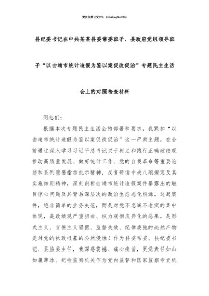 【七哥公文】2025年:【七哥公文】县纪委书记在中共某某县委常委班子、县政府党组领导班子“以曲靖市统计造假为鉴以案促改促治”专题民主生活会上的对照检查材料+更多免费公文+VX:QiGeGongWen2024+更多免费公文+VX:QiGeGongWen2024