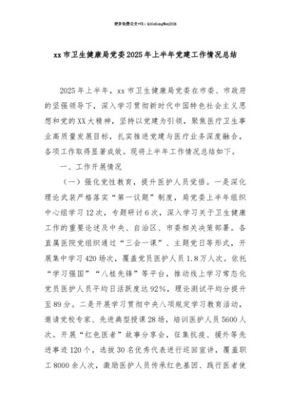 【七哥公文】2025年:【七哥公文】xx市卫生健康局党委2025年上半年党建工作情况总结+更多免费公文+VX:QiGeGongWen2024+更多免费公文+VX:QiGeGongWen2024