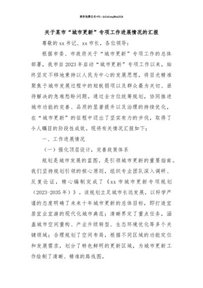 【七哥公文】2025年:【七哥公文】关于某市“城市更新”专项工作进展情况的汇报+更多免费公文+VX:QiGeGongWen2024+更多免费公文+VX:QiGeGongWen2024