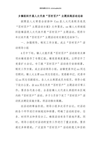 【七哥公文】2025年:【七哥公文】乡镇组织开展人大代表“百村百户”主题实践活动总结+更多免费公文+VX:QiGeGongWen2024+更多免费公文+VX:QiGeGongWen2024