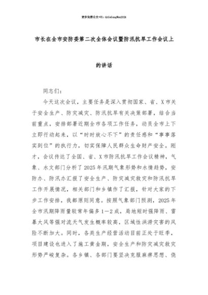 【七哥公文】2025年:【七哥公文】市长在全市安防委第二次全体会议暨防汛抗旱工作会议上的讲话+更多免费公文+VX:QiGeGongWen2024+更多免费公文+VX:QiGeGongWen2024