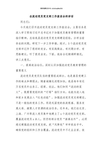 【七哥公文】2025年:【七哥公文】在流动党员党支部工作座谈会的讲话+更多免费公文+VX:QiGeGongWen2024+更多免费公文+VX:QiGeGongWen2024