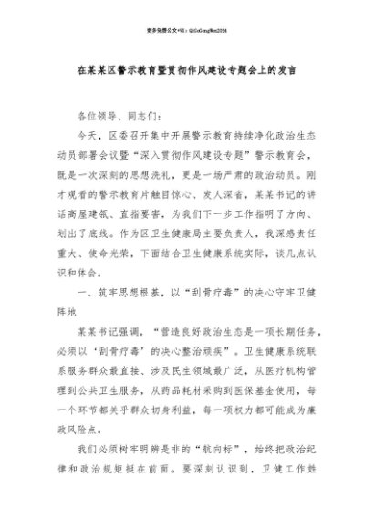 【七哥公文】2025年:【七哥公文】在某某区警示教育暨贯彻作风建设专题会上的发言+更多免费公文+VX:QiGeGongWen2024+更多免费公文+VX:QiGeGongWen2024