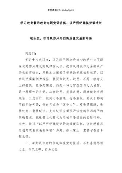 【七哥公文】2025年:【七哥公文】学习教育警示教育专题党课讲稿:以严明纪律规矩锻造过硬队伍,以过硬作风开创高质量发展新局面+更多免费公文+VX:QiGeGongWen2024+更多免费公文+VX:QiGeGongWen2024