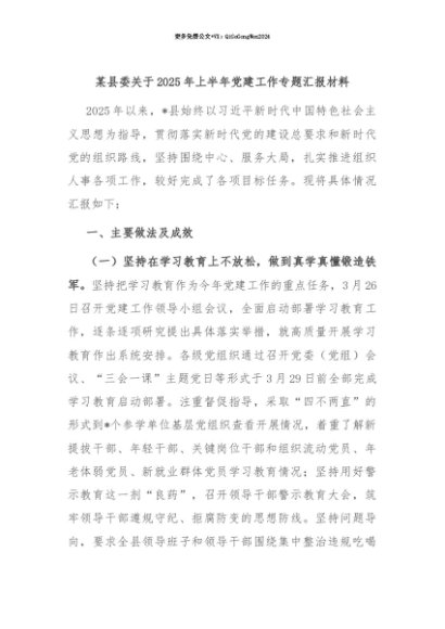 【七哥公文】2025年:【七哥公文】某县委关于2025年上半年党建工作专题汇报材料+更多免费公文+VX:QiGeGongWen2024+更多免费公文+VX:QiGeGongWen2024