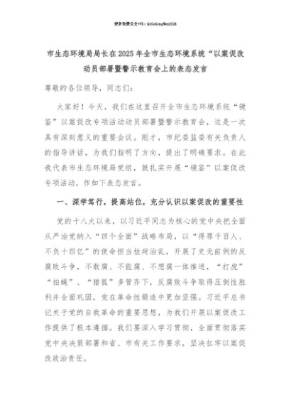 【七哥公文】2025年:【七哥公文】市生态环境局局长在2025年全市生态环境系统“以案促改动员部署暨警示教育会上的表态发言+更多免费公文+VX:QiGeGongWen2024+更多免费公文+VX:QiGeGongWen2024