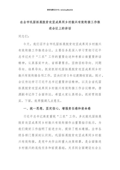 【七哥公文】2025年:【七哥公文】在全市巩固拓展脱贫攻坚成果同乡村振兴有效衔接工作推进会议上的讲话+更多免费公文+VX:QiGeGongWen2024+更多免费公文+VX:QiGeGongWen2024
