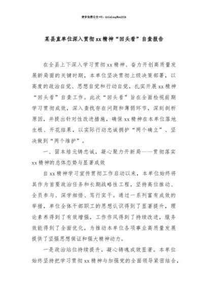 【七哥公文】2025年:【七哥公文】某县直单位深入贯彻xx精神“回头看”自查报告+更多免费公文+VX:QiGeGongWen2024+更多免费公文+VX:QiGeGongWen2024