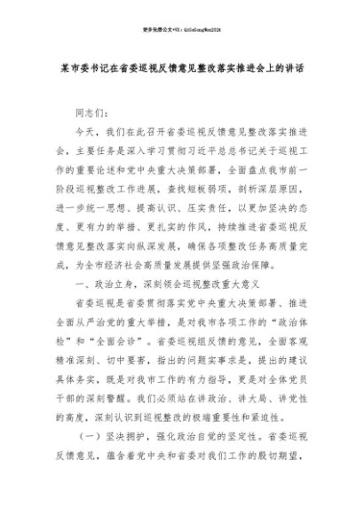 【七哥公文】2025年:【七哥公文】某市委书记在省委巡视反馈意见整改落实推进会上的讲话+更多免费公文+VX:QiGeGongWen2024+更多免费公文+VX:QiGeGongWen2024