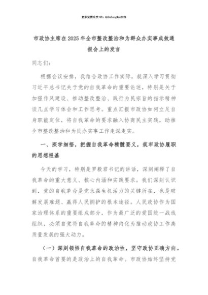 【七哥公文】2025年:【七哥公文】市政协主席在2025年全市整改整治和为群众办实事成效通报会上的发言+更多免费公文+VX:QiGeGongWen2024+更多免费公文+VX:QiGeGongWen2024