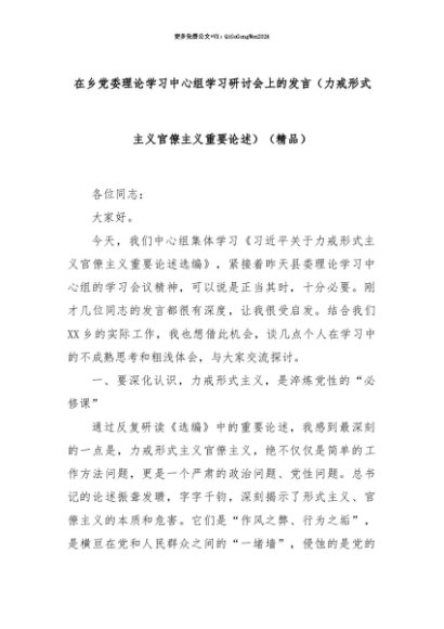 【七哥公文】2025年:【七哥公文】在乡党委理论学习中心组学习研讨会上的发言(力戒形式主义官僚主义重要论述)(精品)+更多免费公文+VX:QiGeGongWen2024+更多免费公文+VX:QiGeGongWen2024