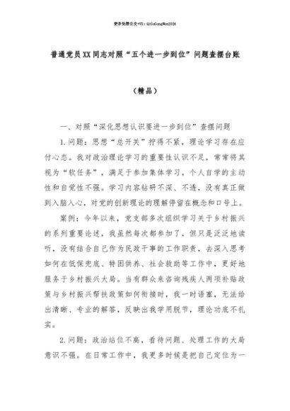 【七哥公文】2025年:【七哥公文】普通党员XX同志对照“五个进一步到位”问题查摆台账(精品)+更多免费公文+VX:QiGeGongWen2024+更多免费公文+VX:QiGeGongWen2024
