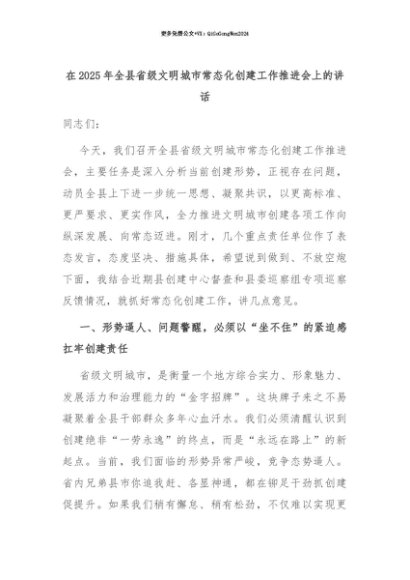 【七哥公文】2025年:【七哥公文】在2025年全县省级文明城市常态化创建工作推进会上的讲话+更多免费公文+VX:QiGeGongWen2024+更多免费公文+VX:QiGeGongWen2024